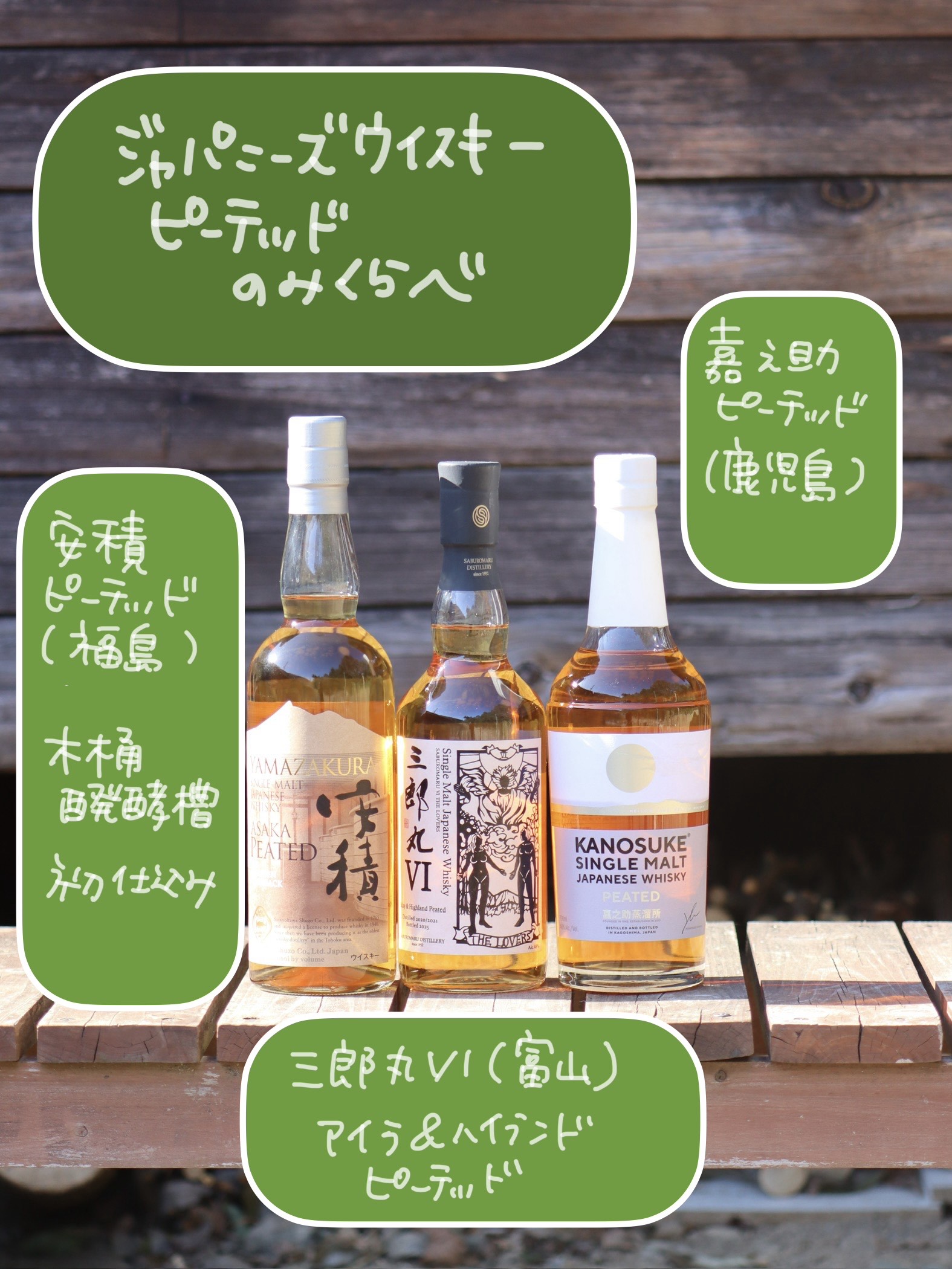 3月の新入荷 2026/3/17 ピート強めなジャパニーズウイスキー飲み比べ。 三郎丸は、白い花、メープルシロップのような香りがあり、 ほどよく酸味もありバランスよし。 安積は、木桶醗酵由来なのか、乳酸感が少しあり。 ヨードが気持ち強め、そしてスモーキー。 嘉乃助は、バーボンのような強めの甘みが特徴的。 そしてスモーキー。 3種それぞれ個性あり。 店内ボトルどれでも一杯500円。